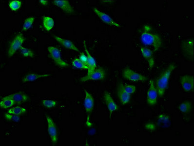 Immunofluorescence staining of U251 cells with CSB-PA11137A0Rb at 1:166, counter-stained with DAPI. The cells were fixed in 4% formaldehyde, permeabilized using 0.2% Triton X-100 and blocked in 10% normal Goat Serum. The cells were then incubated with the antibody overnight at 4°C. The secondary antibody was Alexa Fluor 488-congugated AffiniPure Goat Anti-Rabbit IgG(H+L).