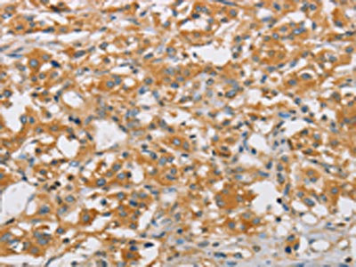 The image on the left is immunohistochemistry of paraffin-embedded Human gastic cancer tissue using CSB-PA409894(ARHGEF7 Antibody) at dilution 1/40, on the right is treated with fusion protein. (Original magnification: ×200)
