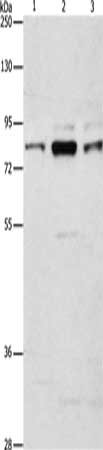 Gel: 8%SDS-PAGE, Lysate: 40 μg, Lane 1-3: Human brain malignant glioma tissue, A172 cells, 293T cells, Primary antibody: CSB-PA409894(ARHGEF7 Antibody) at dilution 1/800, Secondary antibody: Goat anti rabbit IgG at 1/8000 dilution, Exposure time: 3 minutes