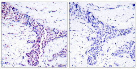 • Immunohistochemical analysis of paraffin-embedded human breast carcinoma tissue using ATF2(Ab-73 or 55) Antibody(left) or the same antibody preincubated with blocking peptide(right).