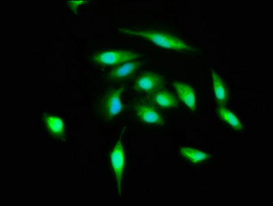 Immunofluorescence staining of Hela cells with CSB-PA002288HA01HU at 1:400, counter-stained with DAPI. The cells were fixed in 4% formaldehyde, permeabilized using 0.2% Triton X-100 and blocked in 10% normal Goat Serum. The cells were then incubated with the antibody overnight at 4°C. The secondary antibody was Alexa Fluor 488-congugated AffiniPure Goat Anti-Rabbit IgG(H+L).