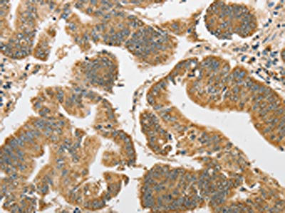 The image on the left is immunohistochemistry of paraffin-embedded Human colon cancer tissue using CSB-PA914063(ATG3 Antibody) at dilution 1/40, on the right is treated with fusion protein. (Original magnification: ×200)