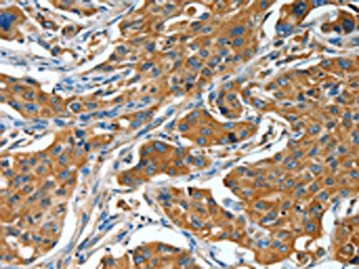 The image on the left is immunohistochemistry of paraffin-embedded Human lung cancer tissue using CSB-PA245428(BAG3 Antibody) at dilution 1/25, on the right is treated with fusion protein. (Original magnification: ×200)