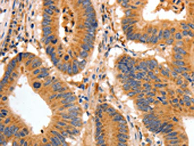 • The image on the left is immunohistochemistry of paraffin-embedded Human colon cancer tissue using CSB-PA585175(BAIAP2 Antibody) at dilution 1/30, on the right is treated with fusion protein. (Original magnification: ×200)