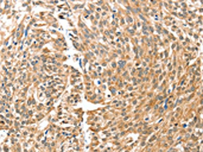 The image on the left is immunohistochemistry of paraffin-embedded Human lung cancer tissue using CSB-PA052042(BAX Antibody) at dilution 1/30, on the right is treated with fusion protein. (Original magnification: ×200)
