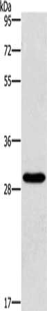 • Gel: 10%SDS-PAGE, Lysate: 40 μg, Lane: Hela cells, Primary antibody: CSB-PA057007(BCL10 Antibody) at dilution 1/950, Secondary antibody: Goat anti rabbit IgG at 1/8000 dilution, Exposure time: 40 seconds