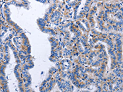 • The image on the left is immunohistochemistry of paraffin-embedded Human thyroid cancer tissue using CSB-PA988388(BDNF Antibody) at dilution 1/40, on the right is treated with synthetic peptide. (Original magnification: ×200)