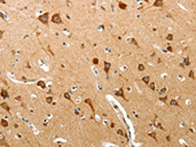 The image on the left is immunohistochemistry of paraffin-embedded Human brain tissue using CSB-PA271700(BIRC6 Antibody) at dilution 1/40, on the right is treated with synthetic peptide. (Original magnification: ×200)