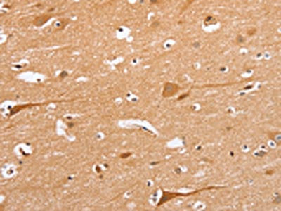 • The image on the left is immunohistochemistry of paraffin-embedded Human brain tissue using CSB-PA195809(BLNK Antibody) at dilution 1/50, on the right is treated with synthetic peptide. (Original magnification: ×200)