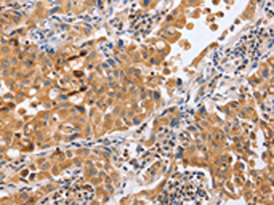 The image on the left is immunohistochemistry of paraffin-embedded Human lung cancer tissue using CSB-PA958582(BLNK Antibody) at dilution 1/50, on the right is treated with synthetic peptide. (Original magnification: ×200)