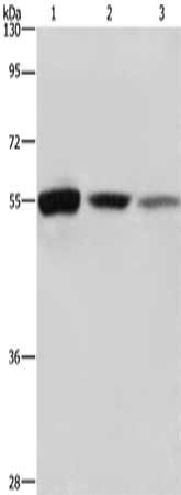 Gel: 8%SDS-PAGE, Lysate: 40 μg, Lane 1-3: Mouse liver, Mouse kidney tissue, Mouse pancreas tissue, Primary antibody: CSB-PA958582(BLNK Antibody) at dilution 1/550, Secondary antibody: Goat anti rabbit IgG at 1/8000 dilution, Exposure time: 40 seconds