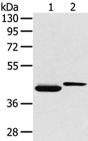 • Gel: 8%SDS-PAGE, Lysate: 40 μg, Lane 1-2: Hela and A431 cell, Primary antibody: CSB-PA763132(BMP4 Antibody) at dilution 1/400 dilution, Secondary antibody: Goat anti rabbit IgG at 1/8000 dilution, Exposure time: 1 minute