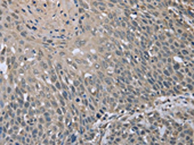 The image on the left is immunohistochemistry of paraffin-embedded Human cervical cancer tissue using CSB-PA229873(BMX Antibody) at dilution 1/30, on the right is treated with fusion protein. (Original magnification: ×200)