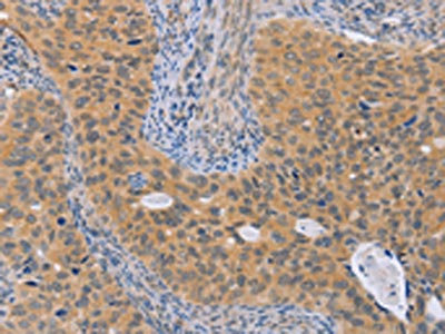 The image on the left is immunohistochemistry of paraffin-embedded Human cervical cancer tissue using CSB-PA439979(BRS3 Antibody) at dilution 1/50, on the right is treated with synthetic peptide. (Original magnification: ×200)