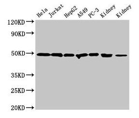 Positive WB detected in: Hela whole cell lysate, Jurkat whole cell lysate, HepG2 whole cell lysate, A549 whole cell lysate, PC-3 whole cell lysate, Rat kidney tissue, Mouse kidney tissue