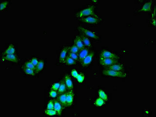 Immunofluorescent analysis of HepG2 cells using CSB-PA004549LA01HU at dilution of 1:100 and Alexa Fluor 488-congugated AffiniPure Goat Anti-Rabbit IgG(H+L)