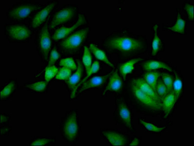 • Immunofluorescence staining of A549 cells with CSB-PA004561YA01HU at 1:166, counter-stained with DAPI. The cells were fixed in 4% formaldehyde, permeabilized using 0.2% Triton X-100 and blocked in 10% normal Goat Serum. The cells were then incubated with the antibody overnight at 4°C. The secondary antibody was Alexa Fluor 488-congugated AffiniPure Goat Anti-Rabbit IgG(H+L).