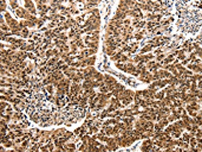 • The image on the left is immunohistochemistry of paraffin-embedded Human lung cancer tissue using CSB-PA012674(CCL2 Antibody) at dilution 1/50, on the right is treated with synthetic peptide. (Original magnification: ×200)