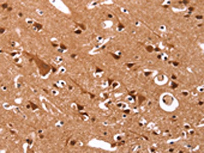 • The image on the left is immunohistochemistry of paraffin-embedded Human brain tissue using CSB-PA975999(CCND3 Antibody) at dilution 1/40, on the right is treated with synthetic peptide. (Original magnification: ×200)