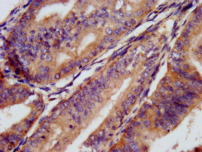 IHC image of CSB-PA004893LA01HU diluted at 1:300 and staining in paraffin-embedded human endometrial cancer performed on a Leica BondTM system. After dewaxing and hydration, antigen retrieval was mediated by high pressure in a citrate buffer (pH 6.0). Section was blocked with 10% normal goat serum 30min at RT. Then primary antibody (1% BSA) was incubated at 4°C overnight. The primary is detected by a biotinylated secondary antibody and visualized using an HRP conjugated SP system.