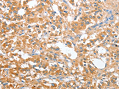 The image on the left is immunohistochemistry of paraffin-embedded Human liver cancer tissue using CSB-PA903031(CD200R1 Antibody) at dilution 1/60, on the right is treated with fusion protein. (Original magnification: ×200)