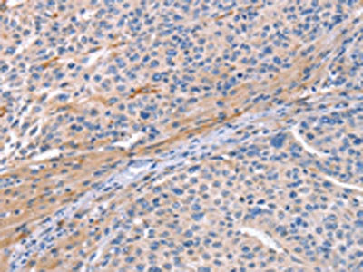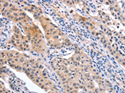 The image on the left is immunohistochemistry of paraffin-embedded Human lung cancer tissue using CSB-PA569443(CD59 Antibody) at dilution 1/30, on the right is treated with synthetic peptide. (Original magnification: ×200)
