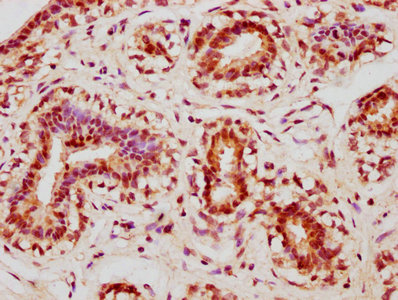 IHC image of CSB-PA361848LA01HU diluted at 1:400 and staining in paraffin-embedded human breast cancer performed on a Leica BondTM system. After dewaxing and hydration, antigen retrieval was mediated by high pressure in a citrate buffer (pH 6.0). Section was blocked with 10% normal goat serum 30min at RT. Then primary antibody (1% BSA) was incubated at 4°C overnight. The primary is detected by a biotinylated secondary antibody and visualized using an HRP conjugated SP system.