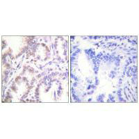 • Western blot analysis of extracts from Colo cells using CDK7 antibody. The lane on the left is treated with synthesized peptide.