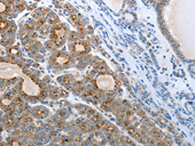 • The image on the left is immunohistochemistry of paraffin-embedded Human thyroid cancer tissue using CSB-PA109108(CEACAM5 Antibody) at dilution 1/25, on the right is treated with synthetic peptide. (Original magnification: ×200)