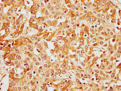• IHC image of CSB-PA13809A0Rb diluted at 1:400 and staining in paraffin-embedded human liver cancer performed on a Leica BondTM system. After dewaxing and hydration, antigen retrieval was mediated by high pressure in a citrate buffer (pH 6.0). Section was blocked with 10% normal goat serum 30min at RT. Then primary antibody (1% BSA) was incubated at 4°C overnight. The primary is detected by a biotinylated secondary antibody and visualized using an HRP conjugated SP system.