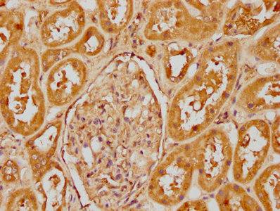 • IHC image of CSB-PA13809A0Rb diluted at 1:400 and staining in paraffin-embedded human kidney tissue performed on a Leica BondTM system. After dewaxing and hydration, antigen retrieval was mediated by high pressure in a citrate buffer (pH 6.0). Section was blocked with 10% normal goat serum 30min at RT. Then primary antibody (1% BSA) was incubated at 4°C overnight. The primary is detected by a biotinylated secondary antibody and visualized using an HRP conjugated SP system.