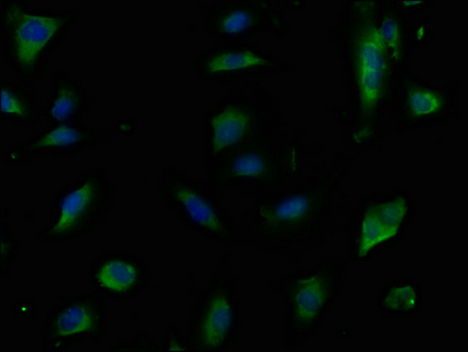 • Immunofluorescence staining of U251 cells with CSB-PA005381PA01HU at 1:50,counter-stained with DAPI. The cells were fixed in 4% formaldehyde, permeabilized using 0.2% Triton X-100 and blocked in 10% normal Goat Serum. The cells were then incubated with the antibody overnight at 4°C.The secondary antibody was Alexa Fluor 488-congugated AffiniPure Goat Anti-Rabbit IgG (H+L).