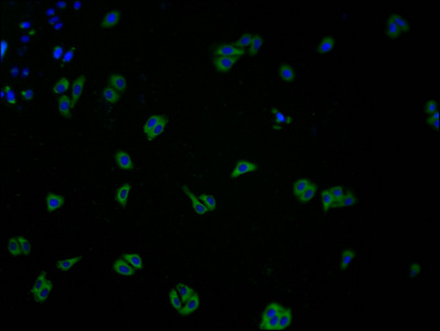 Immunofluorescence staining of HepG2 cells with CSB-PA005492LA01HU at 1:100, counter-stained with DAPI. The cells were fixed in 4% formaldehyde and blocked in 10% normal Goat Serum. The cells were then incubated with the antibody overnight at 4°C. The secondary antibody was Alexa Fluor 488-congugated AffiniPure Goat Anti-Rabbit IgG(H+L).