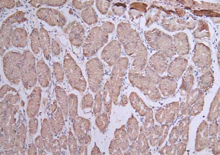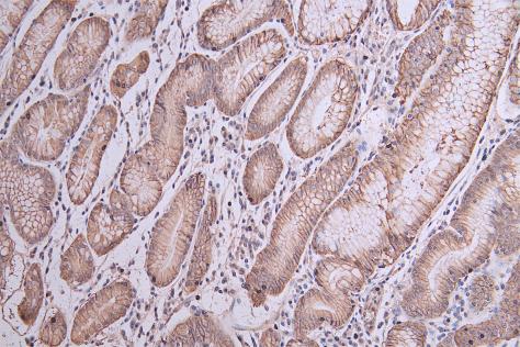 • IHC image of CSB-PA005498ESR1HU diluted at 1:50 and staining in paraffin-embedded human stomach tissue performed on a Leica BondTM system. After dewaxing and hydration, antigen retrieval was mediated by high pressure in a citrate buffer (pH 6.0). Section was blocked with 10% normal goat serum 30min at RT. Then primary antibody (1% BSA) was incubated at 4°C overnight. The primary is detected by a Goat anti-rabbit polymer IgG labeled by HRP and visualized using 0.05% DAB.