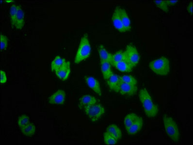 Immunofluorescence staining of HepG2 cells with CSB-PA005614LA01HU at 1:100, counter-stained with DAPI. The cells were fixed in 4% formaldehyde, permeabilized using 0.2% Triton X-100 and blocked in 10% normal Goat Serum. The cells were then incubated with the antibody overnight at 4°C. The secondary antibody was Alexa Fluor 488-congugated AffiniPure Goat Anti-Rabbit IgG(H+L).