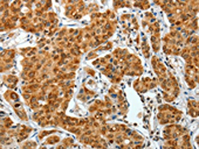 The image on the left is immunohistochemistry of paraffin-embedded Human lung cancer tissue using CSB-PA182143(COL1A2 Antibody) at dilution 1/70, on the right is treated with fusion protein. (Original magnification: ×200)