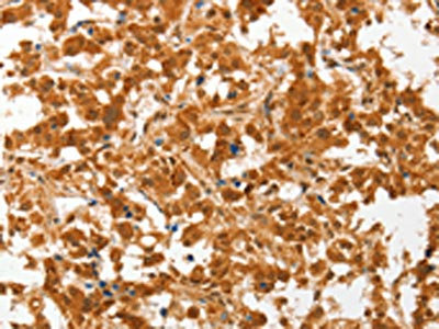 The image on the left is immunohistochemistry of paraffin-embedded Human thyroid cancer tissue using CSB-PA223164(COL4A3BP Antibody) at dilution 1/50, on the right is treated with fusion protein. (Original magnification: ×200)