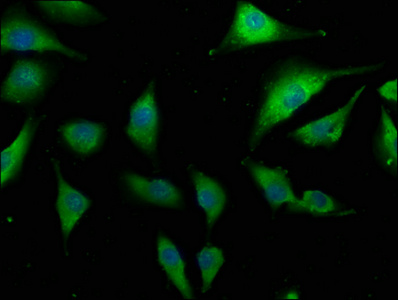 • Immunofluorescence staining of U251 cells with CSB-PA005751OA01HU at 1:133, counter-stained with DAPI. The cells were fixed in 4% formaldehyde, permeabilized using 0.2% Triton X-100 and blocked in 10% normal Goat Serum. The cells were then incubated with the antibody overnight at 4°C. The secondary antibody was Alexa Fluor 488-congugated AffiniPure Goat Anti-Rabbit IgG(H+L).