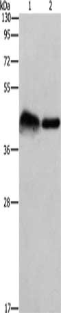 Gel: 10%SDS-PAGE, Lysate: 40 μg, Lane 1-2: Mouse bladder tissue, 293T cells, Primary antibody: CSB-PA255746(CRELD1 Antibody) at dilution 1/930, Secondary antibody: Goat anti rabbit IgG at 1/8000 dilution, Exposure time: 5 minutes