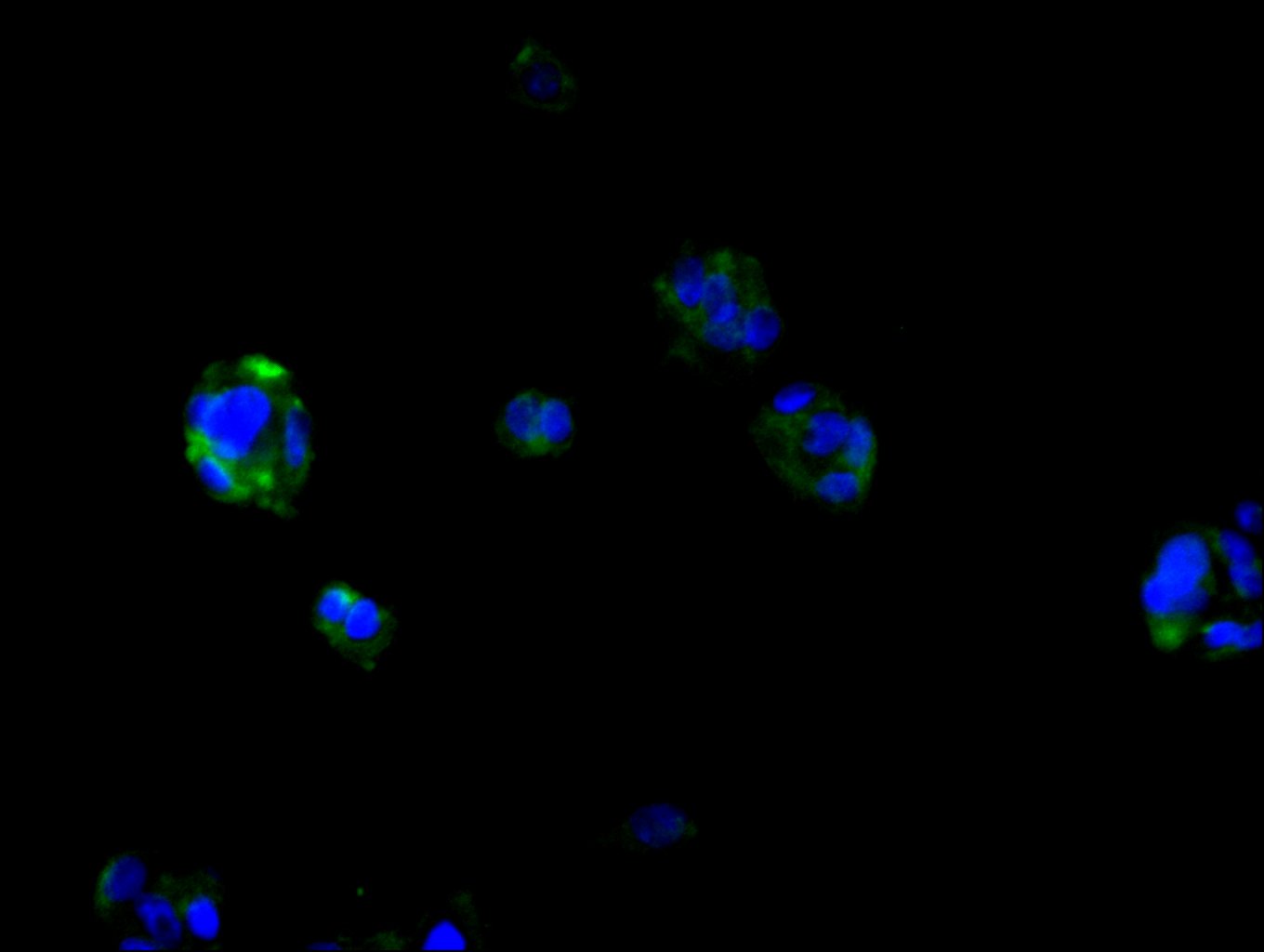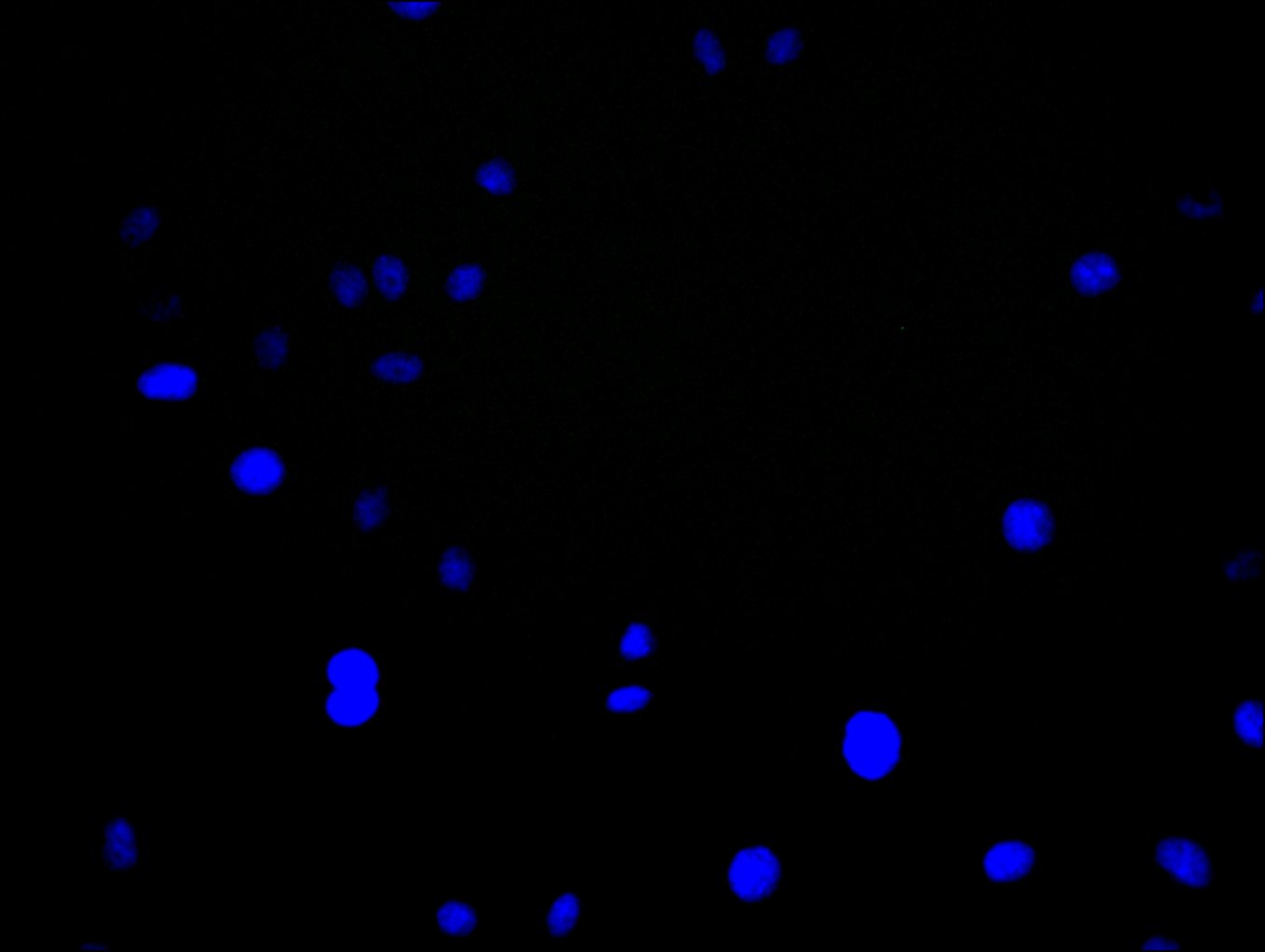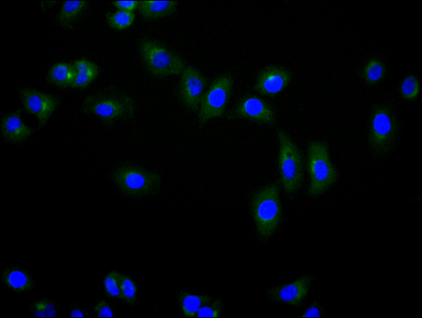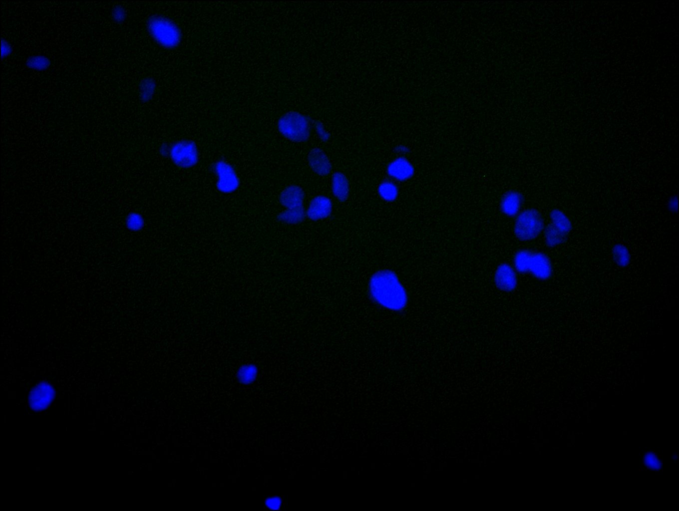 • Immunofluorescence staining of Hela cell with CSB-PA623797LA01HU at 1:20, counter-stained with DAPI. The cells were fixed in 4% formaldehyde and blocked in 10% normal Goat Serum. The cells were then incubated with the antibody overnight at 4C. The secondary antibody was Alexa Fluor 488-congugated AffiniPure Goat Anti-Rabbit IgG(H+L).