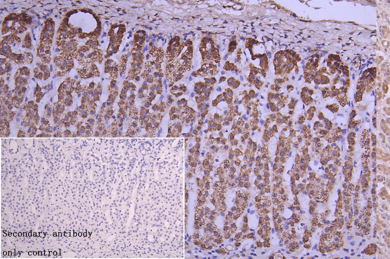• IHC image of CSB-PA623797LA01HU diluted at 1:150 and staining in paraffin-embedded human adrenal gland tissue performed on a Leica BondTM system. After dewaxing and hydration, antigen retrieval was mediated by high pressure in a citrate buffer (pH 6.0). Section was blocked with 10% normal goat serum 30min at RT. Then primary antibody (1% BSA) was incubated at 4°C overnight. The primary is detected by a Goat anti-rabbit polymer IgG labeled by HRP and visualized using 0.05% DAB. Secondary antibody only control: uses 1% BSA instead of primary antibody