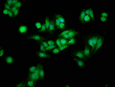 • Immunofluorescence staining of HepG2 cells with CSB-PA00174A0Rb at 1:166, counter-stained with DAPI. The cells were fixed in 4% formaldehyde, permeabilized using 0.2% Triton X-100 and blocked in 10% normal Goat Serum. The cells were then incubated with the antibody overnight at 4°C. The secondary antibody was Alexa Fluor 488-congugated AffiniPure Goat Anti-Rabbit IgG(H+L).