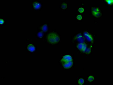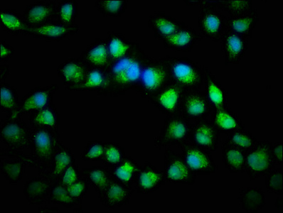 • Immunofluorescence staining of Hela cells with CSB-PA00174A0Rb at 1:166, counter-stained with DAPI. The cells were fixed in 4% formaldehyde, permeabilized using 0.2% Triton X-100 and blocked in 10% normal Goat Serum. The cells were then incubated with the antibody overnight at 4°C. The secondary antibody was Alexa Fluor 488-congugated AffiniPure Goat Anti-Rabbit IgG(H+L).