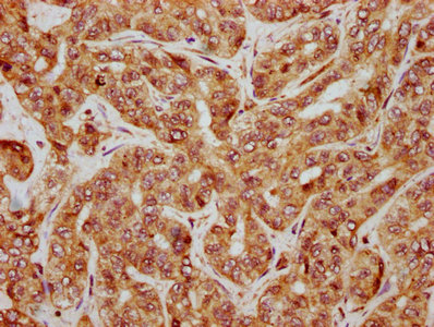 • IHC image of CSB-PA00174A0Rb diluted at 1:500 and staining in paraffin-embedded human liver cancer performed on a Leica BondTM system. After dewaxing and hydration, antigen retrieval was mediated by high pressure in a citrate buffer (pH 6.0). Section was blocked with 10% normal goat serum 30min at RT. Then primary antibody (1% BSA) was incubated at 4°C overnight. The primary is detected by a biotinylated secondary antibody and visualized using an HRP conjugated SP system.