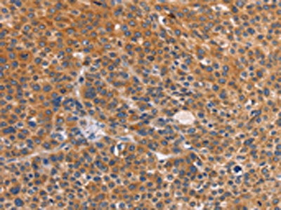 The image on the left is immunohistochemistry of paraffin-embedded Human liver cancer tissue using CSB-PA115010(CTSC Antibody) at dilution 1/50, on the right is treated with synthetic peptide. (Original magnification: ×200)