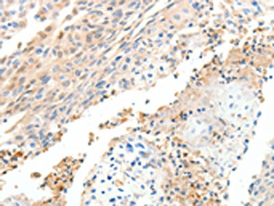 The image on the left is immunohistochemistry of paraffin-embedded Human cervical cancer tissue using CSB-PA185715(CXCL12 Antibody) at dilution 1/40, on the right is treated with synthetic peptide. (Original magnification: ×200)