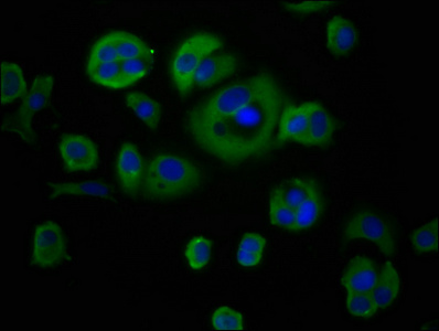Immunofluorescence staining of MCF-7 cells with CSB-PA006323LA01HU at 1:66, counter-stained with DAPI. The cells were fixed in 4% formaldehyde, permeabilized using 0.2% Triton X-100 and blocked in 10% normal Goat Serum. The cells were then incubated with the antibody overnight at 4°C. The secondary antibody was Alexa Fluor 488-congugated AffiniPure Goat Anti-Rabbit IgG(H+L).