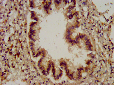 IHC image of CSB-PA006323LA01HU diluted at 1:200 and staining in paraffin-embedded human lung tissue performed on a Leica BondTM system. After dewaxing and hydration, antigen retrieval was mediated by high pressure in a citrate buffer (pH 6.0). Section was blocked with 10% normal goat serum 30min at RT. Then primary antibody (1% BSA) was incubated at 4°C overnight. The primary is detected by a biotinylated secondary antibody and visualized using an HRP conjugated SP system.