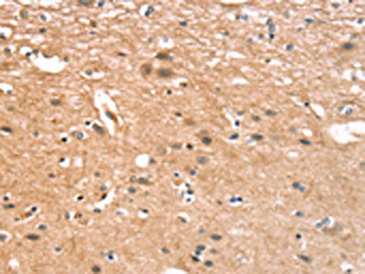 The image on the left is immunohistochemistry of paraffin-embedded Human brain tissue using CSB-PA906934(CYLD Antibody) at dilution 1/35, on the right is treated with synthetic peptide. (Original magnification: ×200)