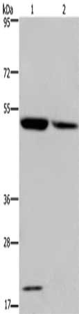 Gel: 6%SDS-PAGE, Lysate: 40 μg, Lane 1-2: Mouse liver tissue, human fetal liver tissue, Primary antibody: CSB-PA033966(CYP27A1 Antibody) at dilution 1/200, Secondary antibody: Goat anti rabbit IgG at 1/8000 dilution, Exposure time: 7 minutes